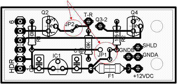 NOTE: Install JP1 and JP2 as shown. Remove trace just above JP1 label